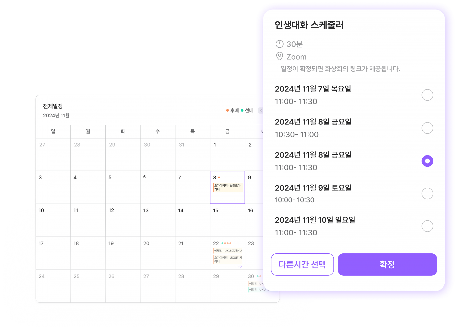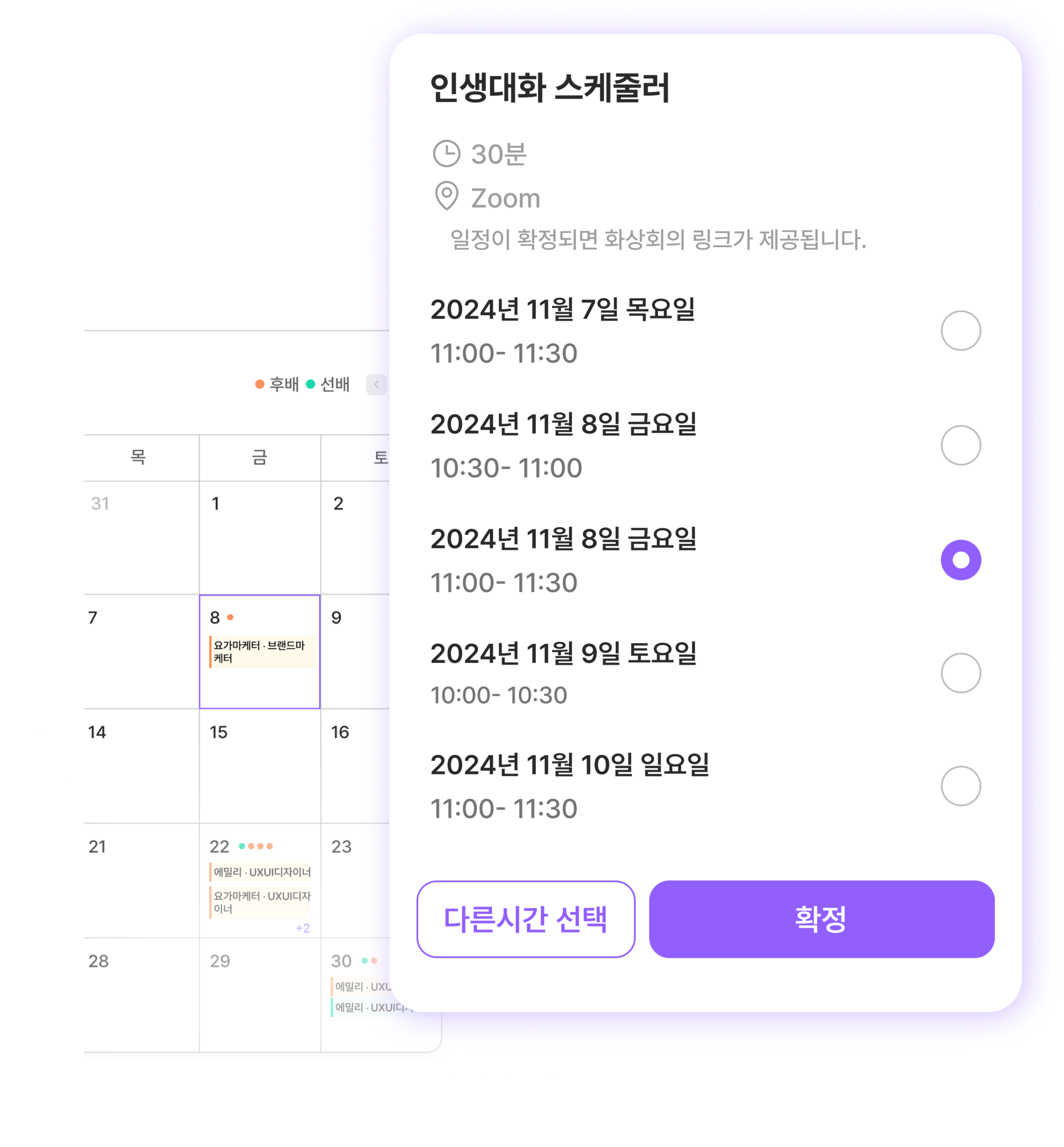 선배님이 가능하신 다섯 개의 시간 옵션을 선택하시면, 후배님이 다섯 개 중 하나의 시간을 선택해 확정하는 방식입니다. 대화시간이 확정되면 라이프챗 서비스 내 Upcoming Chatt 에 자동으로 줌링크가 생성됩니다.