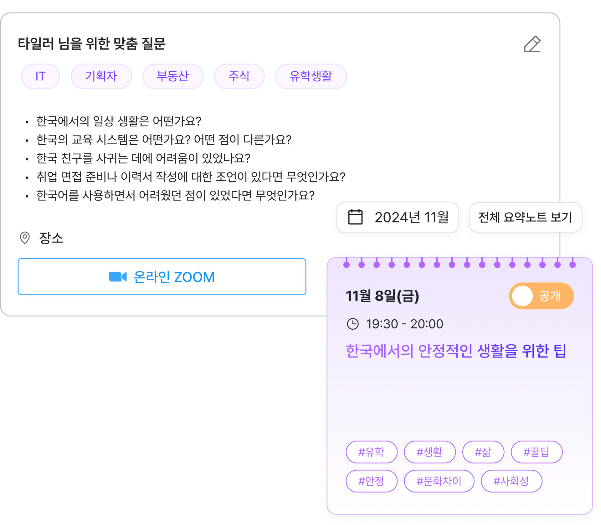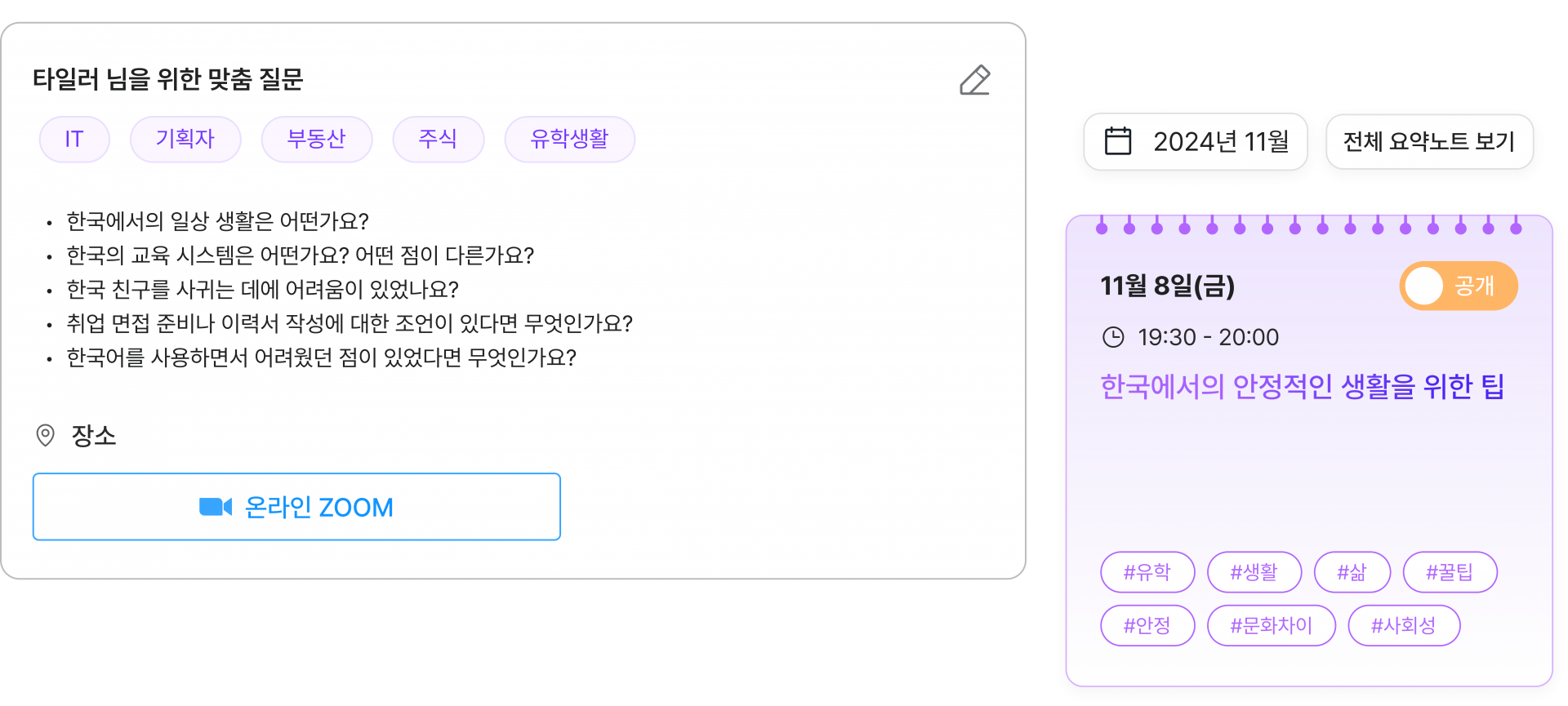 라이프챗 AI가 당신에게 꼭 맞는맞춤형 질문노트와 핵심만 쏙 담은 대화 요약노트까지 자동으로 만들어드려요