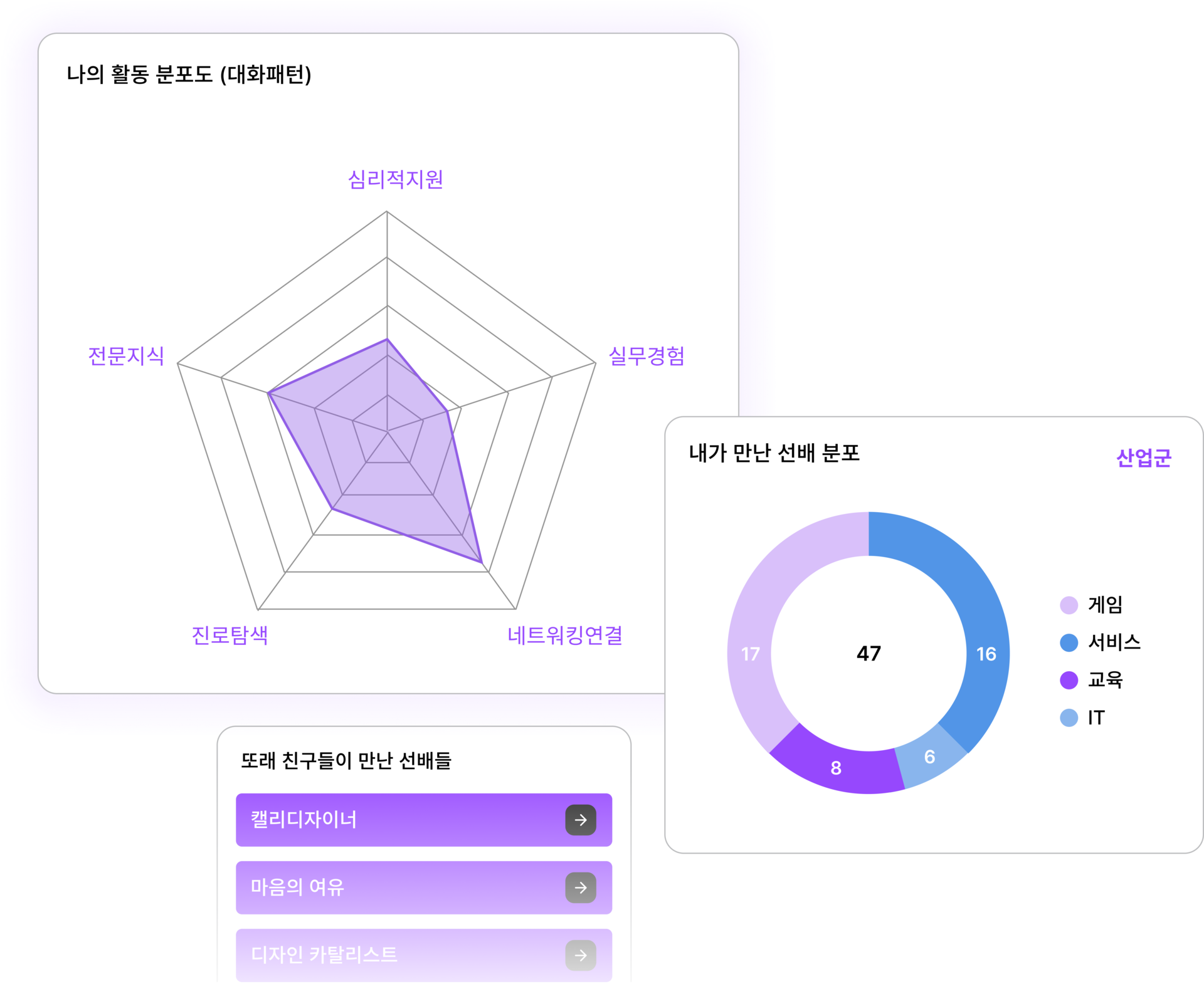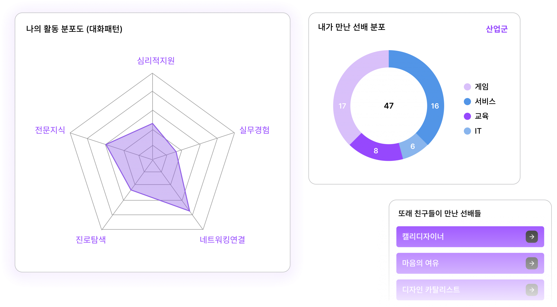 프로필 카드를 통해 나와 비슷한 관심사·진로의 선후배를 바로 확인해요