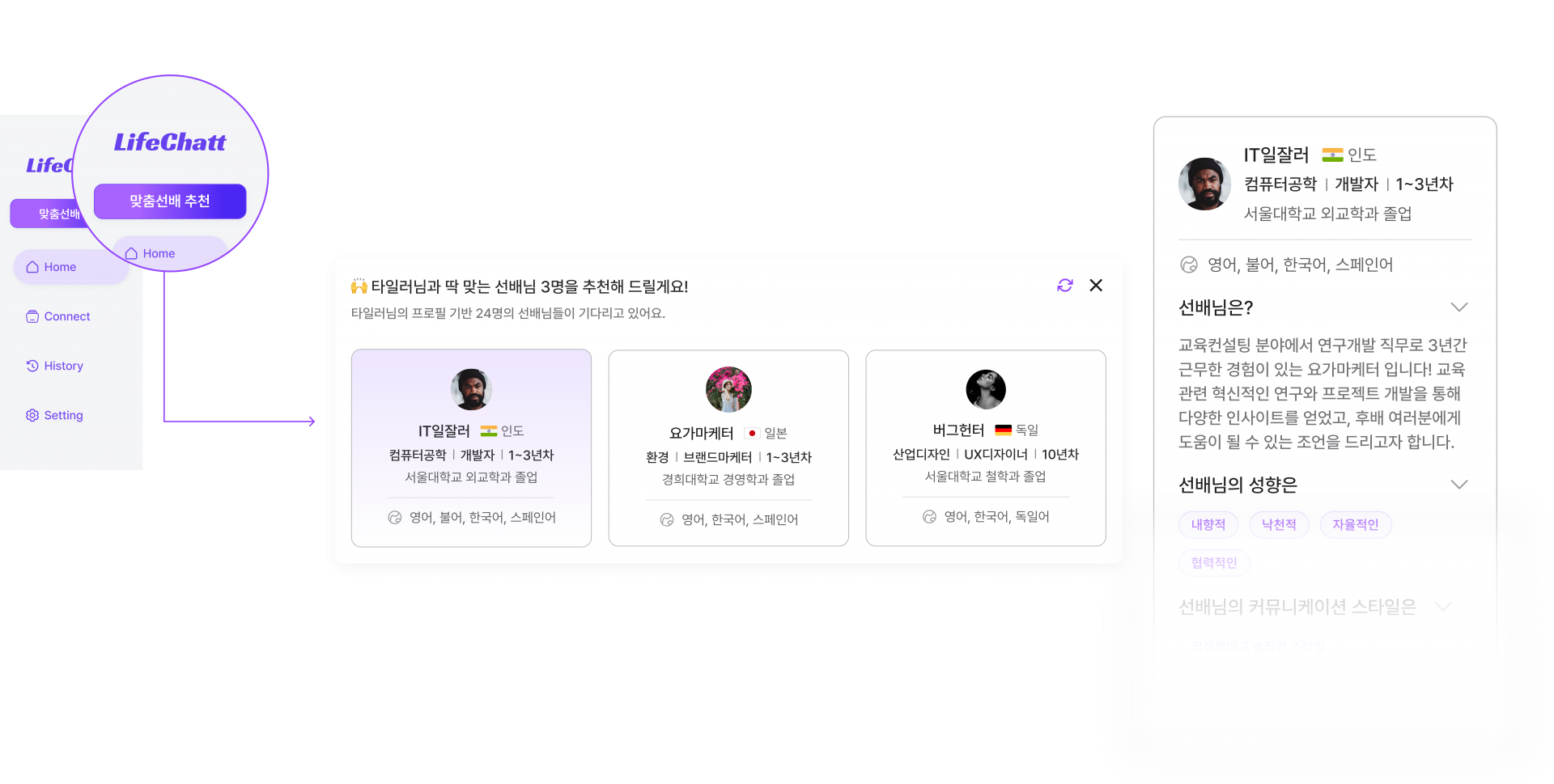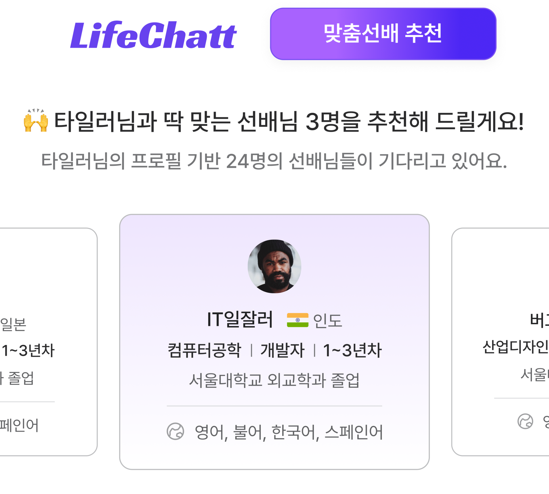 AI 기반 프로필 분석으로, 나와 맞는 3명의 선배를 추천해드려요